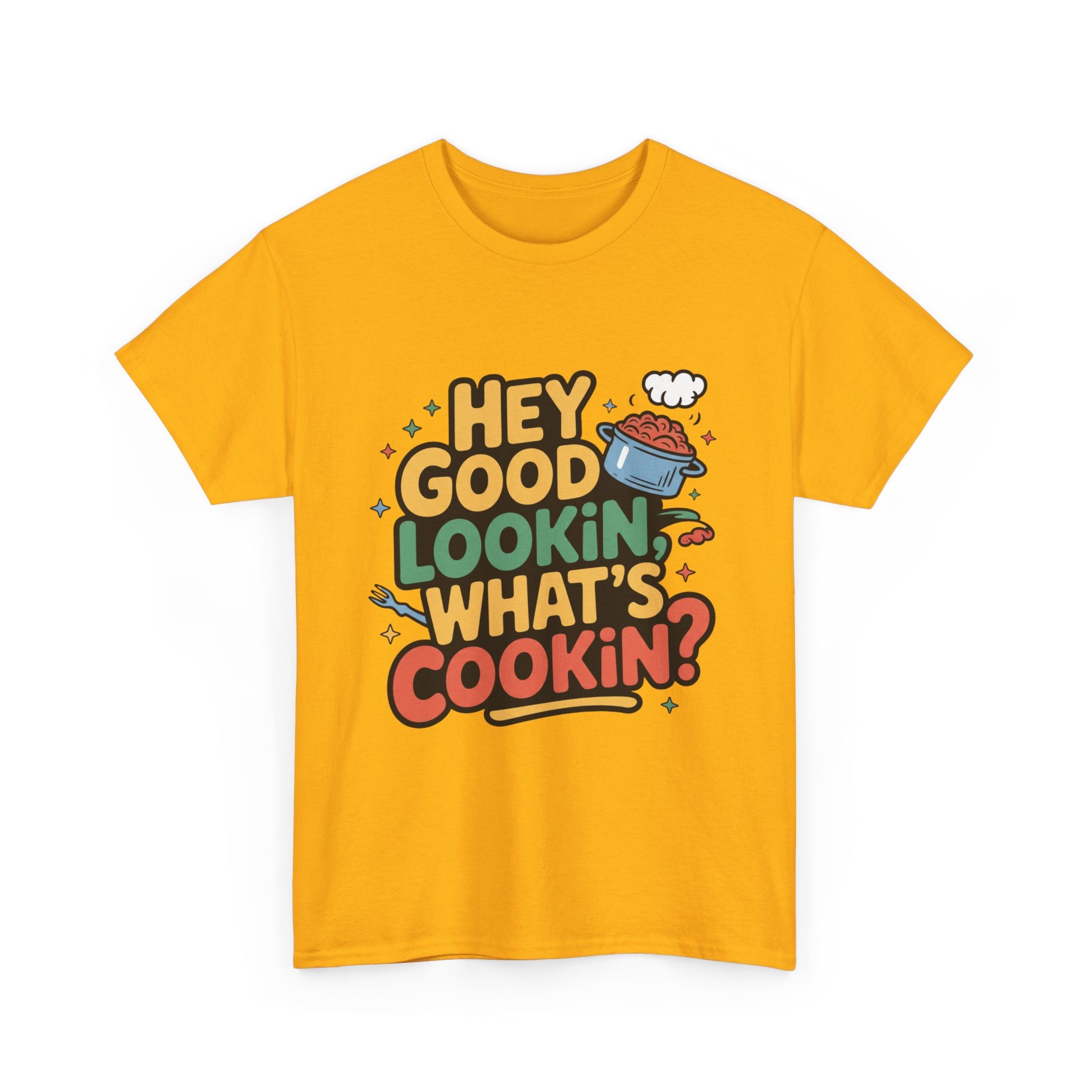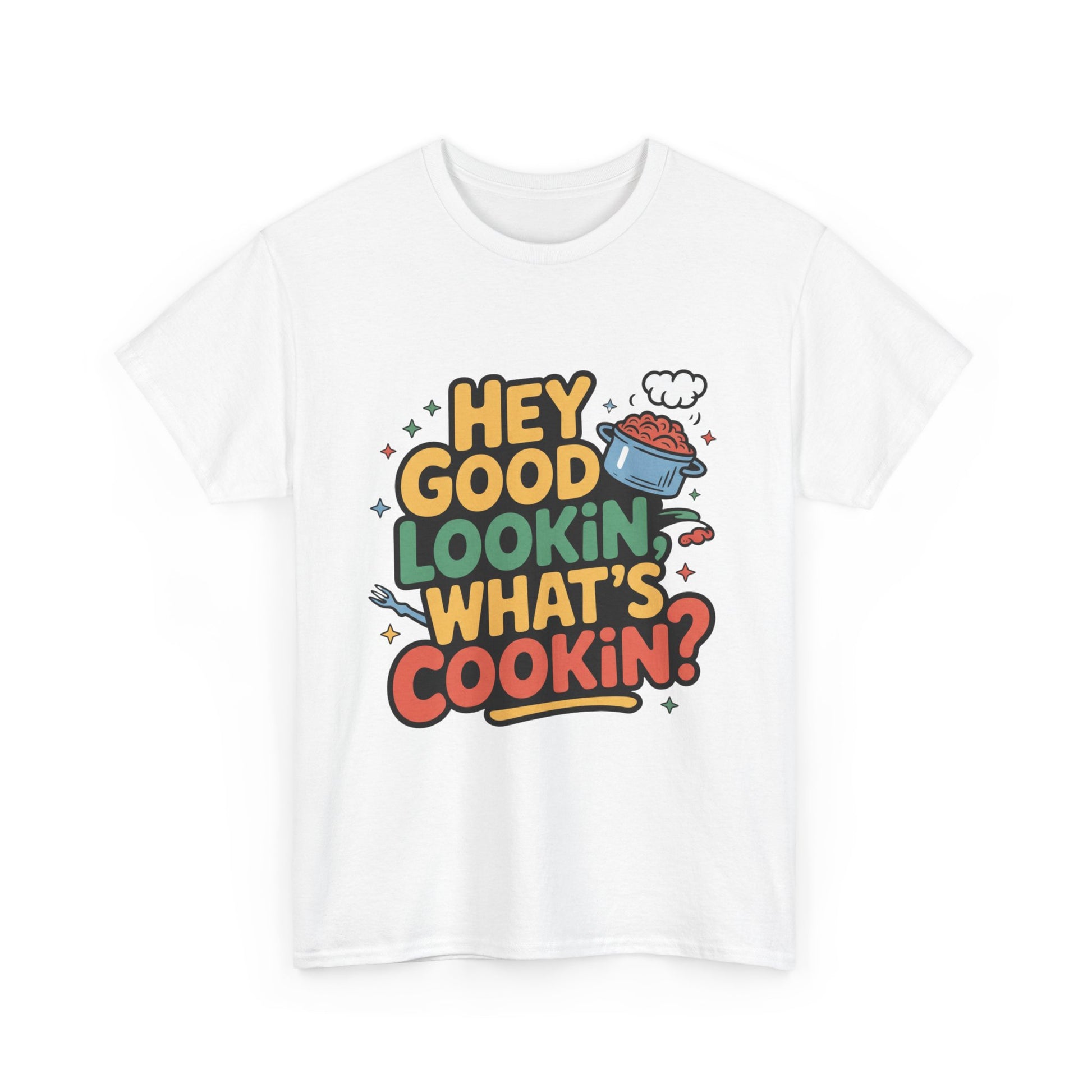 Introducing the perfect blend of comfort and style with this Unisex Heavy Cotton Tee. Featuring a playful design that reads, "Hey Good Lookin' What's Cookin'?", this tee brings a fun and casual vibe to your wardrobe. It offers an effortlessly cool look that's perfect for gatherings, outings, or just lounging at home. This tee is ideal for food lovers, home cooks, or anyone who appreciates a touch of humor in their fashion. It’s a great gift for birthdays, housewarming parties, or any casual celebration, making it a versatile addition to your collection. Wear it to show off your love for cooking or simply to enjoy a relaxed day out!